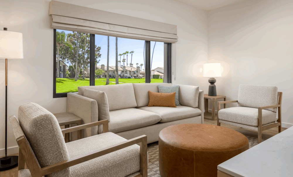 Our Double Queen Studio Suite features two Queen beds, a Queen sleeper sofa, table, and refrigerator. Enjoy San Diego’s idyllic climate with your private sliding door designed to bring the fresh coastal breeze indoors.