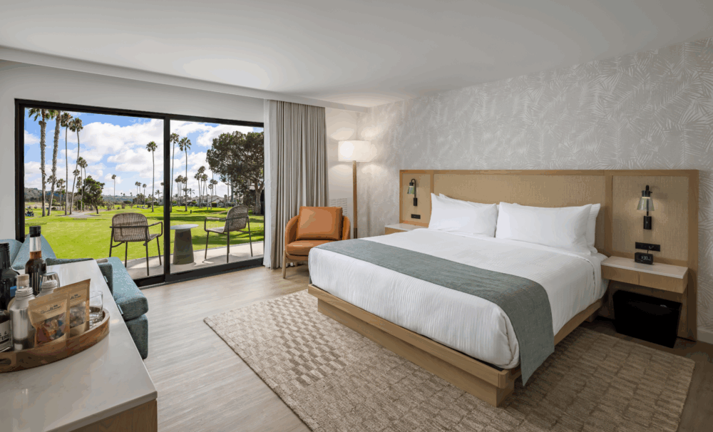 Our Accessible Club King guest room features a king bed, cozy accent chair, table and refrigerator. With a private sliding door to a patio, you can relax and enjoy San Diego’s beautiful year-round climate from the comfort of your room.