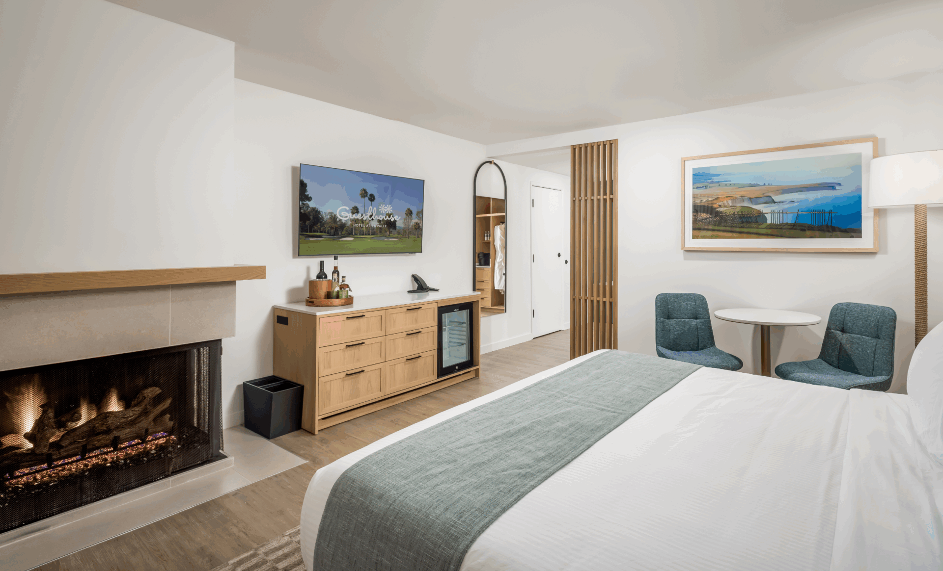 Our Accessible Golf View King Fireplace guest room features a king bed, work table and refrigerator. With a sliding door and a patio, this room offers a view of the South Course 9th Green and promotes admiration of the fantastic setting and lovely weather.